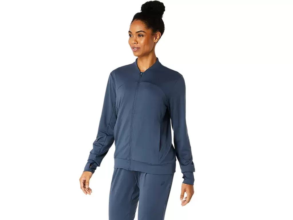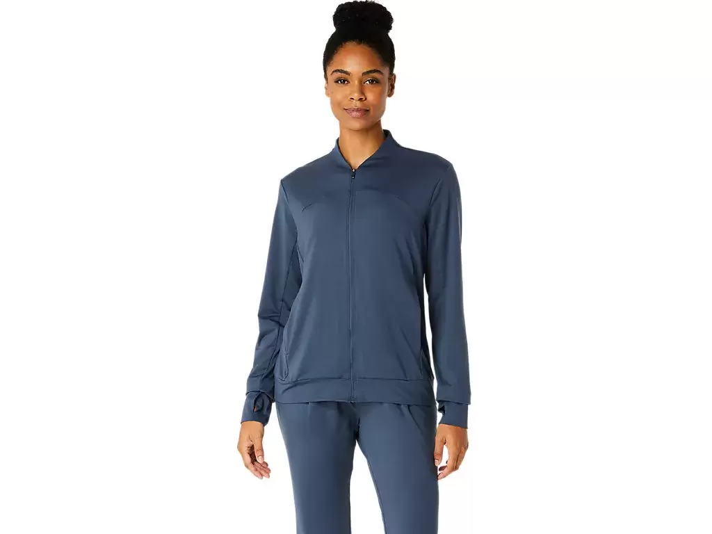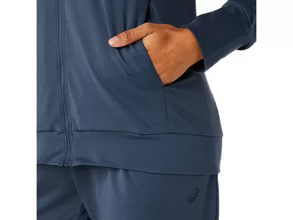 Diese Jacke besteht aus einem weichen, dehnbaren Strickstoff, der sich für verschiedene Aktivitäten eignet.