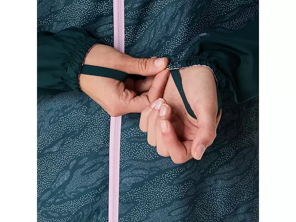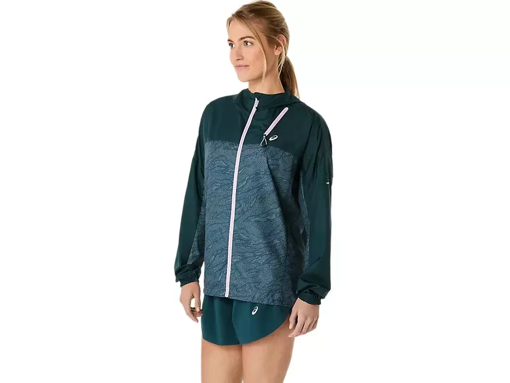 Die Jacke ist mit einem Allover-Printmuster versehen und kann während des Laufs einfach ausgezogen und in der Brusttasche verstaut werden.
