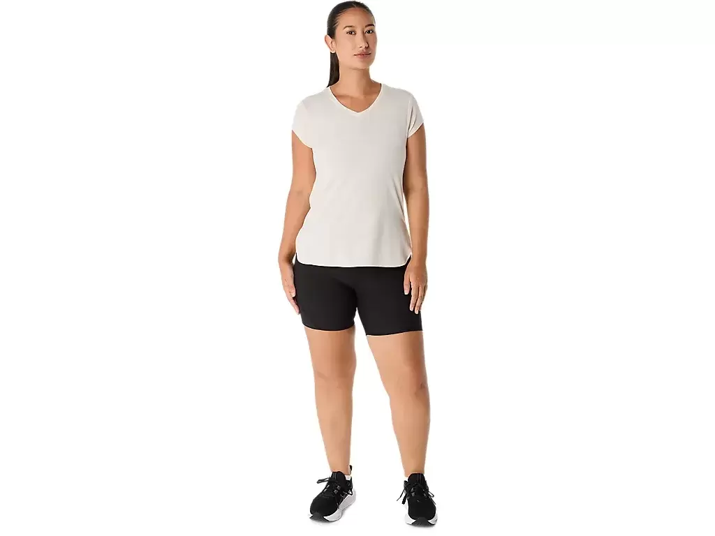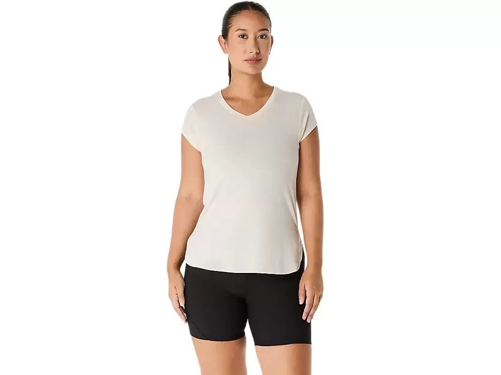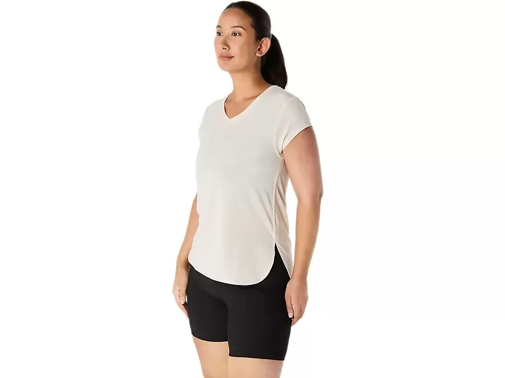 Dieses kurzärmlige Top mit V-Ausschnitt liegt angenehm auf der Haut. Es besteht aus einem bequemen Strickstoff mit nach vorne verlegten Seitennähten für mehr Bewegungsfreiheit.