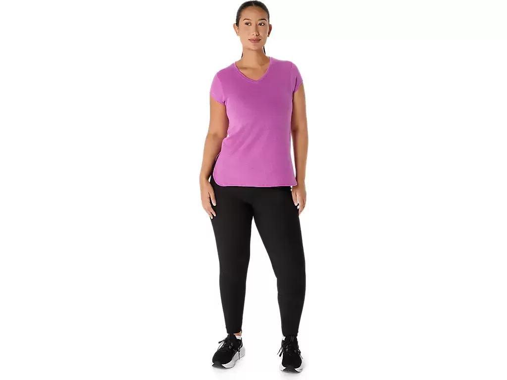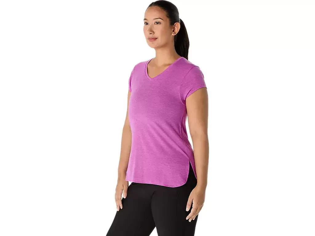 Dieses kurzärmlige Top mit V-Ausschnitt liegt angenehm auf der Haut. Es besteht aus einem bequemen Strickstoff mit nach vorne verlegten Seitennähten für mehr Bewegungsfreiheit.