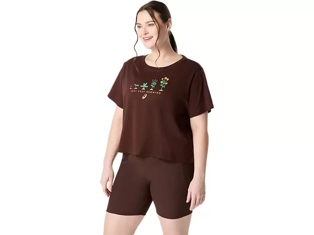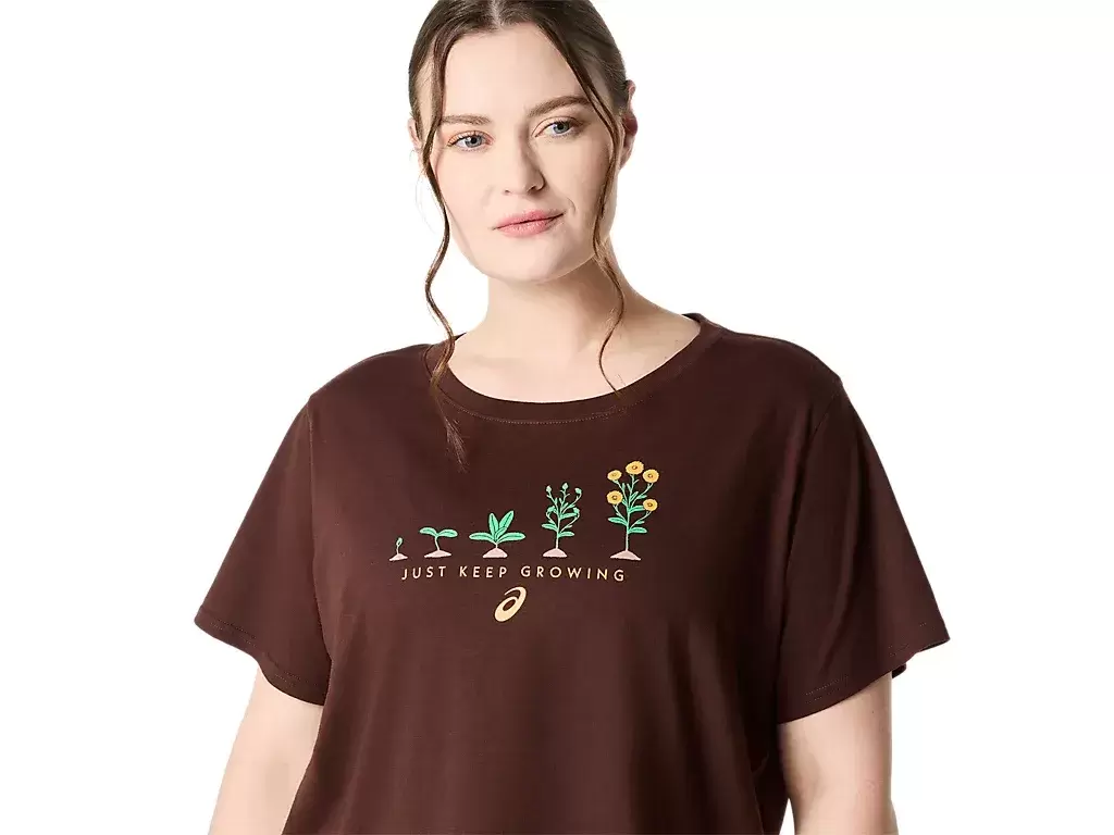 Dieses bequeme, kurzärmlige Strick-T-Shirt zeigt auf der Vorderseite eine Reihe von Pflanzengrafiken in verschiedenen Stadien ihres Wachstumszyklus. Darunter steht außerdem der Satz „JUST KEEP GROWING“.