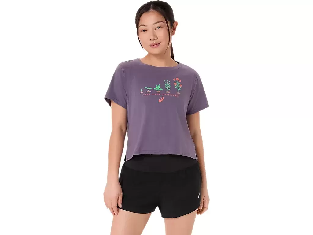 Dieses bequeme, kurzärmlige Strick-T-Shirt zeigt auf der Vorderseite eine Reihe von Pflanzengrafiken in verschiedenen Stadien ihres Wachstumszyklus. Darunter steht außerdem der Satz „JUST KEEP GROWING“.