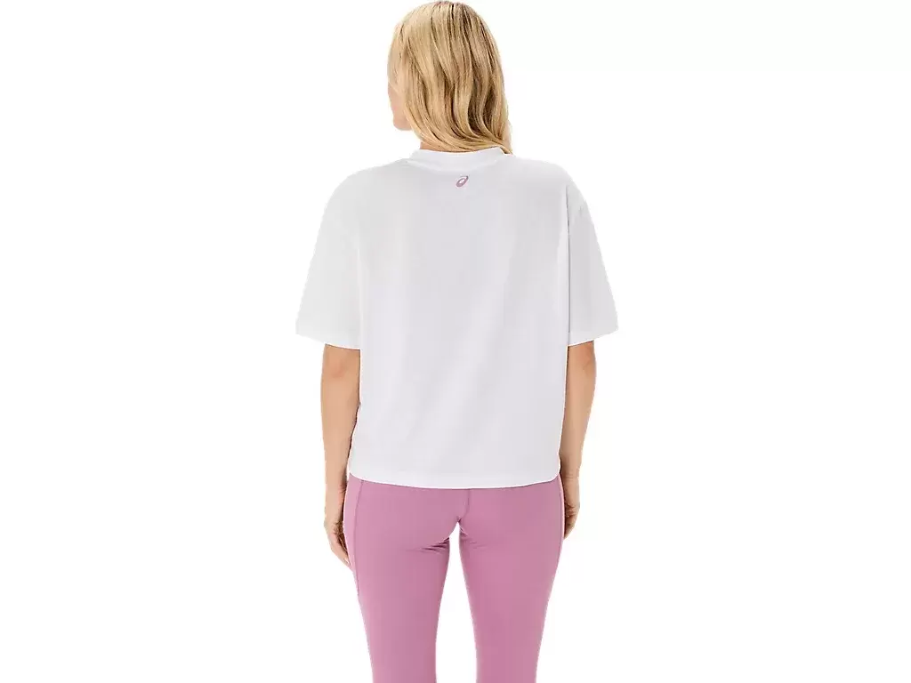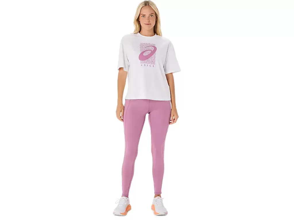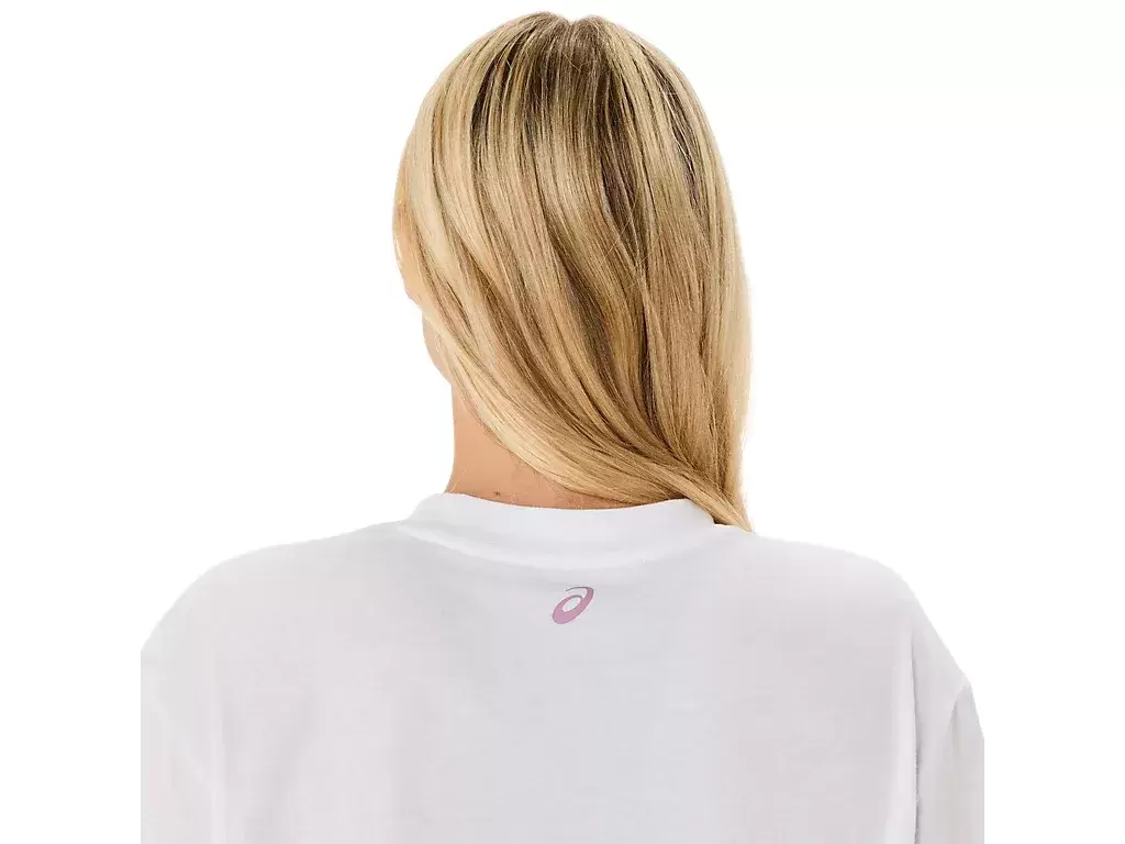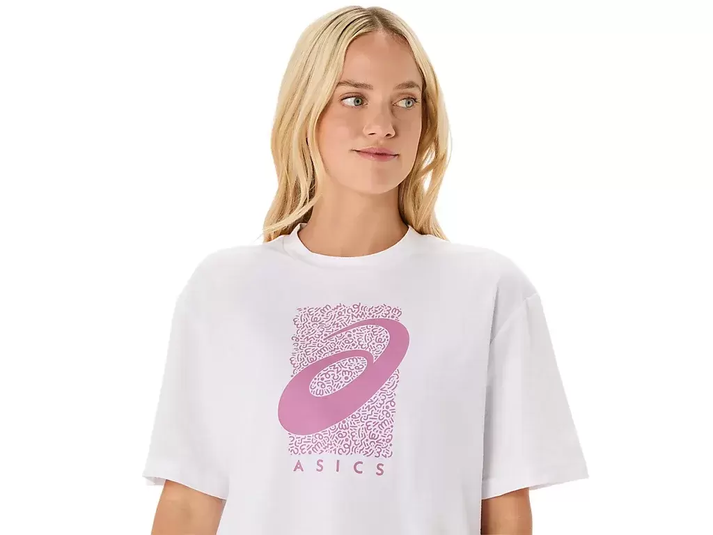 Das Oberteil wird außerdem durch eine saisonale ASICS® Spiral-Grafik, eine verkürzte Länge, ein entspanntes Passformdesign und Seitenschlitze für mehr Bewegungsfreiheit ergänzt.