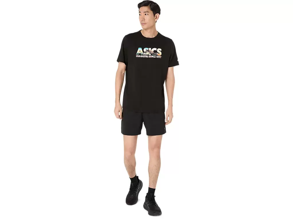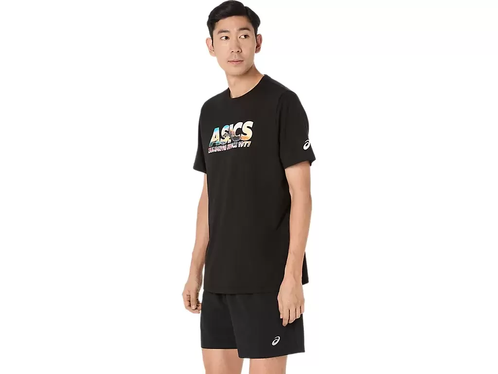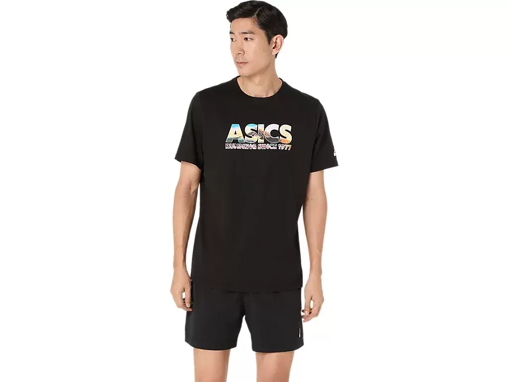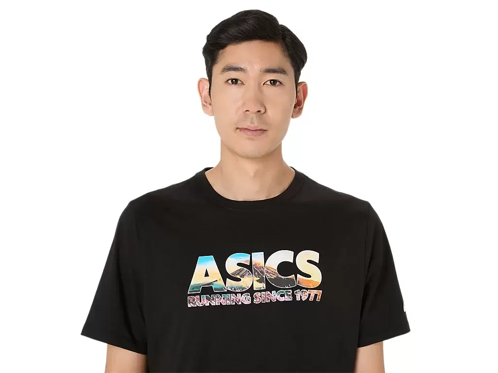 Dieses bequeme, kurzärmlige Strick-T-Shirt ist vom Fuji inspiriert. Die Grafik auf der Vorderseite zeigt den Satz „ASICS GLOBAL RUN CLUB“, der mit einem Kirschblüten- und Berggipfel-Print dargestellt ist.