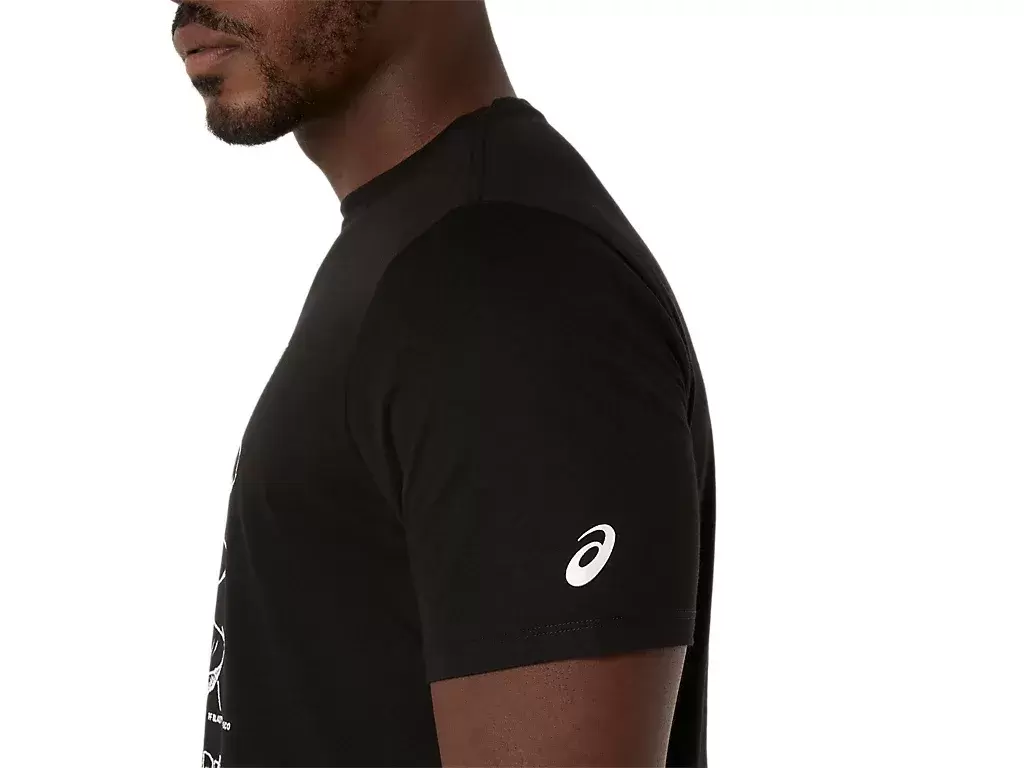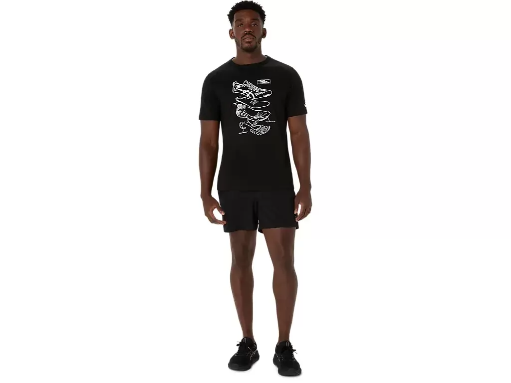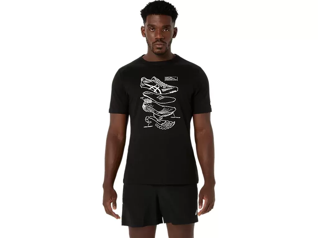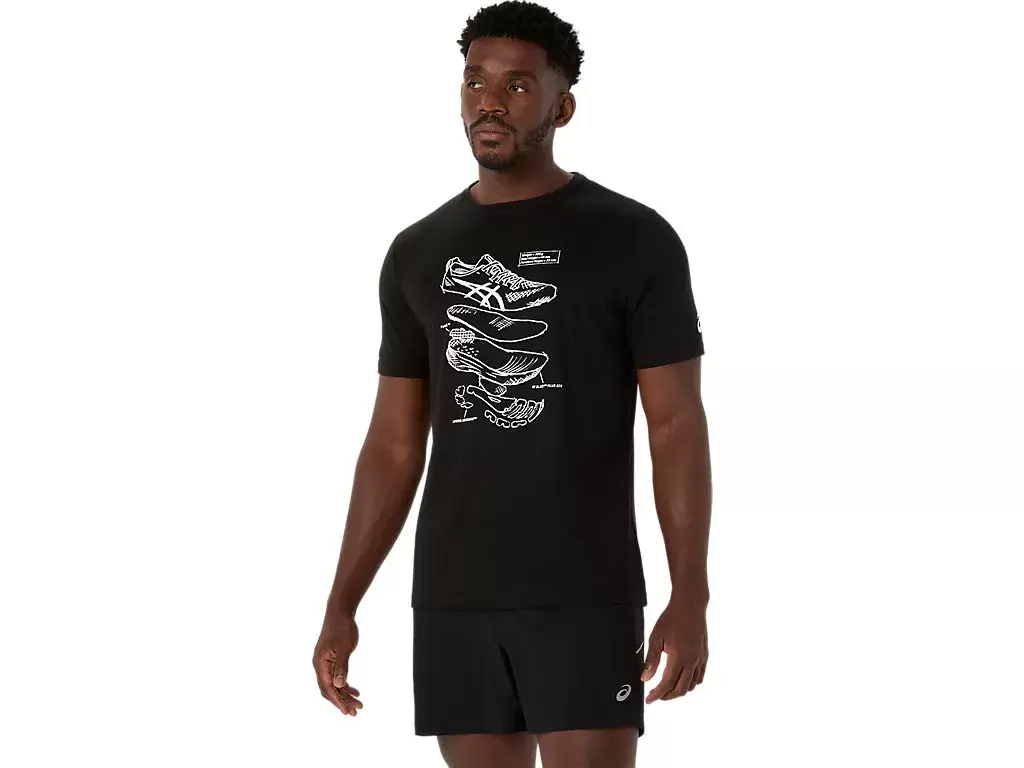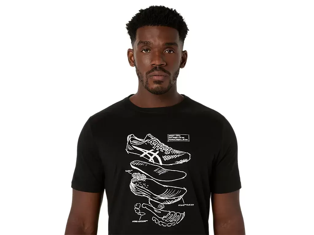 Dieses bequeme, kurzärmlige Strick-T-Shirt ist von den Skizzen der Performance-Laufschuhe von ASICS inspiriert. Es ist mit einer Grafik auf der Vorderseite bedruckt, die die verschiedenen Komponenten zeigt, aus denen unsere Laufschuhe bestehen.