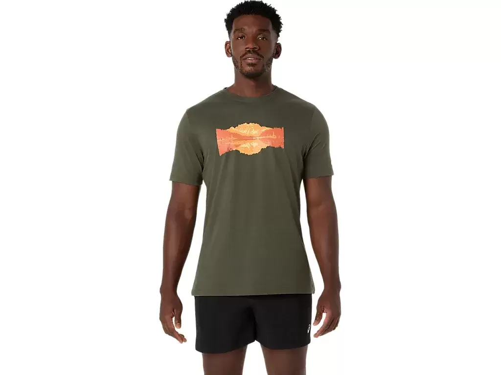 Dieses bequeme, kurzärmlige Strick-T-Shirt ist von der Natur inspiriert. Die Grafik auf der Vorderseite zeigt einen ruhigen See mit Berggipfeln in der Ferne.