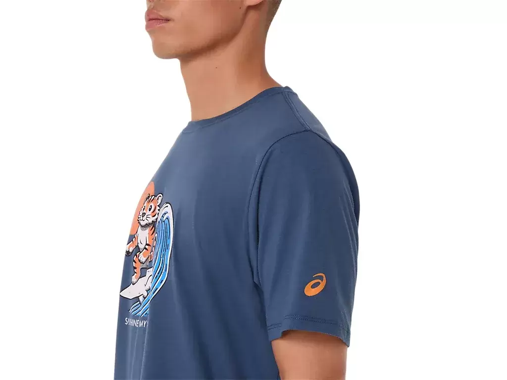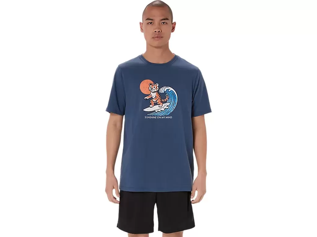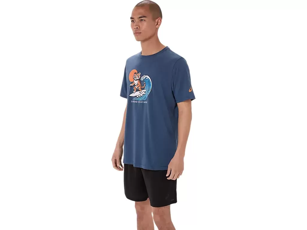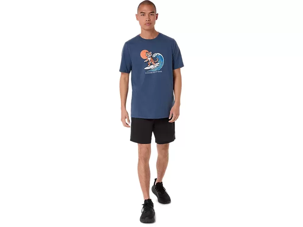 Dieses bequeme, kurzärmlige Strick-T-Shirt ist vom Strand inspiriert. Die Grafik auf der Vorderseite zeigt einen surfenden Tiger, darunter steht der Satz „SUNSHINE ON MY MIND“.