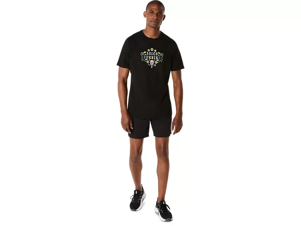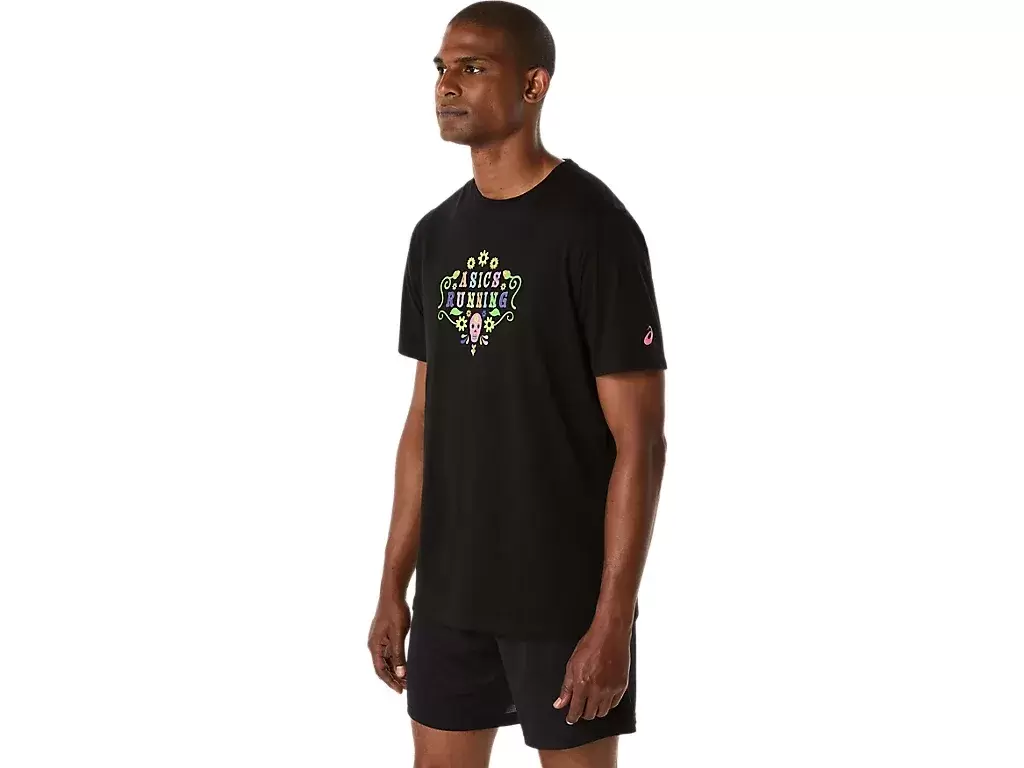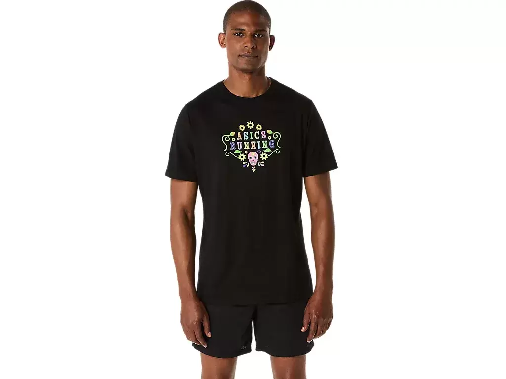Das stylische und bequeme DAY OF THE DEAD Kurzarm-T-Shirt ist vielseitig einsetzbar und eignet sich für verschiedene Aktivitäten. Das Kleidungsstück ist mit Totenkopf- und Blumengrafiken gestaltet, die in der Mitte den Schriftzug „ASICS RUNNING“ umrahmen. Dieses Muster wird zusätzlich durch eine im Dunkeln leuchtende Applikation akzentuiert – für einen umwerfenden Look bei schlechten Lichtverhältnissen. Das T-Shirt besteht aus weichem Baumwoll-Mischjersey für höchsten Tragekomfort.